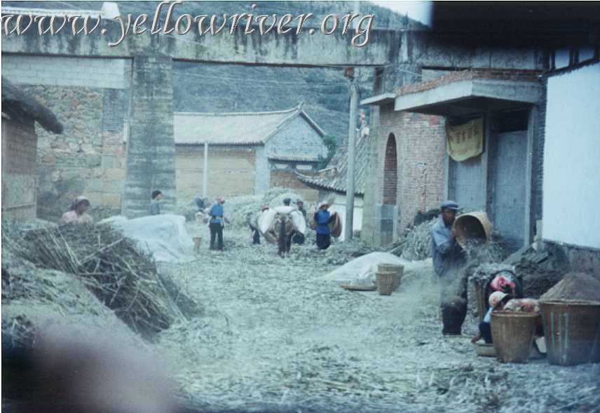 ![]() 洱海边的农民将收获的庄稼铺在公路上,让来往的汽车为其脱粒。 |