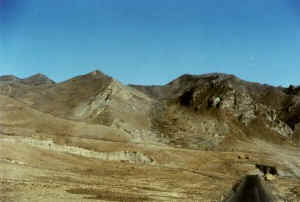 扁都口内祁连山山地景观。下部是灌丛草被,上部是流石荒漠(海拔在3500米以上)。 |